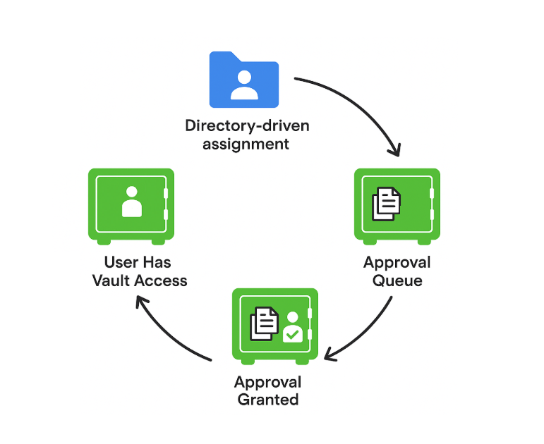 SecureAnyBox "Tags" and "Templates" help to create the approval queue mechanism for connecting directory group memberships to vaults.