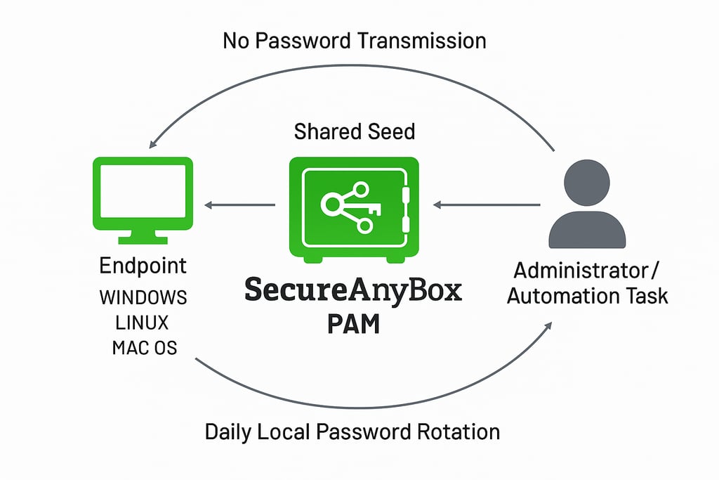 SecureAnyBox includes an Agent for Windows, Linux, and macOS that can automatically rotate local administrator accounts on a daily schedule. The key to this feature is that the password is not transmitted from the Agent to the Server. Instead, both the Agent and the Server generate the password independently using a shared seed.